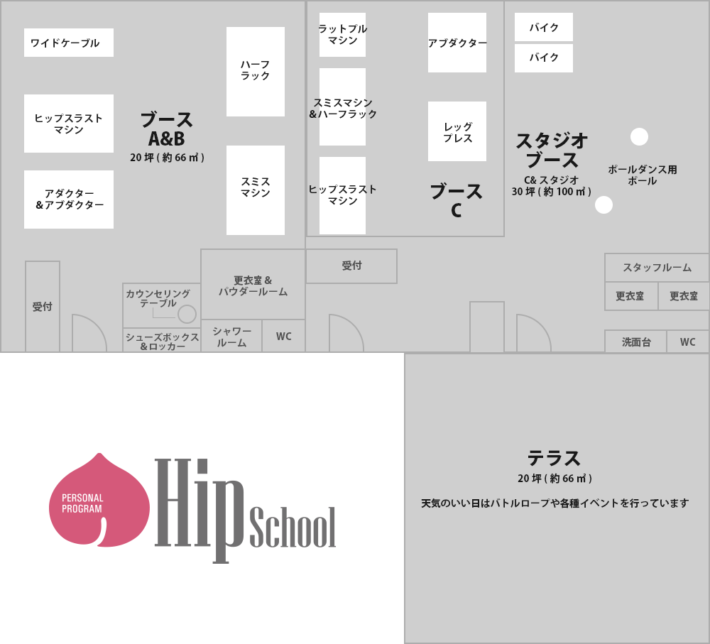 HipSchoolでは、女性のボディメイクに特化した最新のマシンを取り揃えています。 プライバシーに配慮した個室ブースや、開放的なスタジオ、テラスなど、 目的に合わせて快適にトレーニングいただける環境をご用意しています。